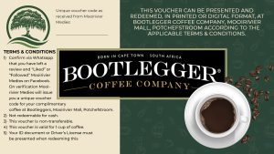 Once you have completed the “Coffee on us task”, please contact Mooirivier Medies using the WhatsApp button on the bottom right of the webpage, or send an email to: mediesinfo@mooirivier.com or contact us via our contact form for the password and voucher code for your complimentary coffee at Bootleggers.